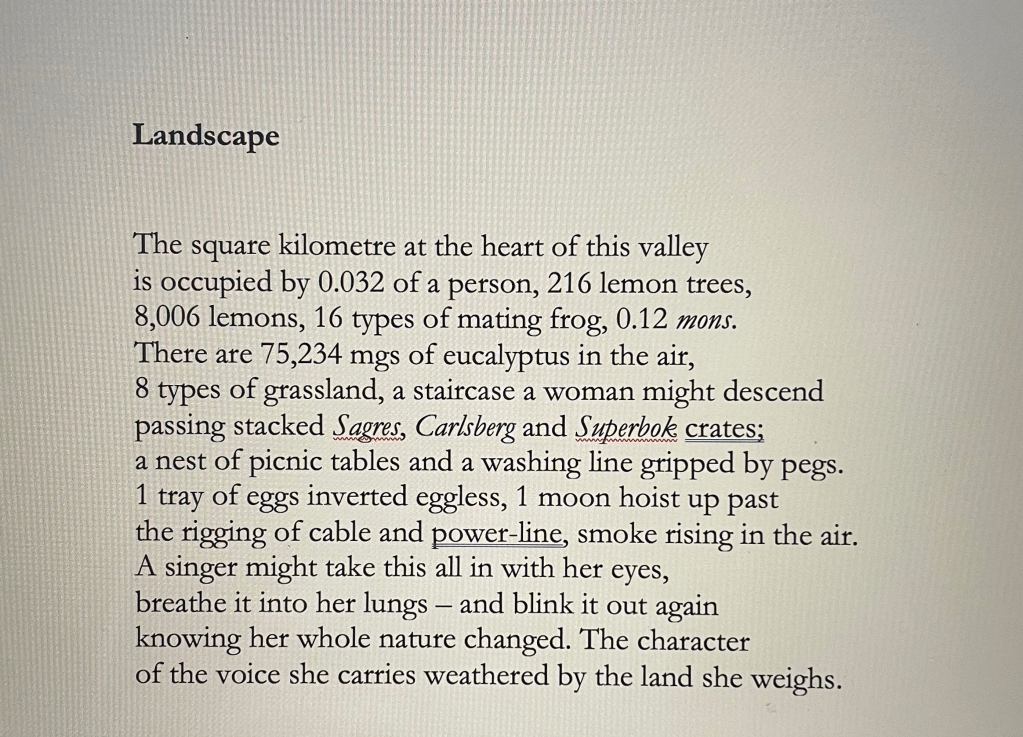 I was imagining how I might capture this landscape in a poem – landscape in a ‘terroir’ sense: the combination of soil, climate and environment that gives character to a wine. The poem opens with an element of parody, documenting the scene in precise figures to which no one could have access: 0.032 of a person, 75,234 mgs of eucalyptus. This kind of enumeration and calculation was to miss the spirit of the landscape entirely. I had in mind Ted Hughes’s ‘Pike’ which begins in a similarly literal way: ‘Pike, three inches long’, ‘A pond I fished, fifty yards across’, before the pike make a mockery of such rational thinking: ‘one jammed to the gills down the other’s gullet’, the pond itself ‘as deep as England.’