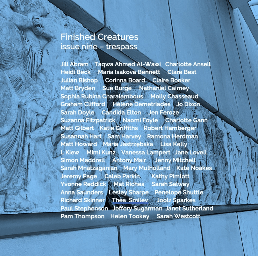 It’s always great to see a new issue of Finished Creatures, edited by Jan Heritage. Her online launches understand the pleasure of sharing work with like-minded people (there’s an in-person launch in London, too). I often find that editors choose poems I don’t particularly care for, but Jan always picks the ones I would hope she would. I’ve two poems in this issue, ‘The Contest’ and ‘Advisory’. This issue is on the theme of trespass and the poems here walk an often uncomfortable line. You can buy an issue here.