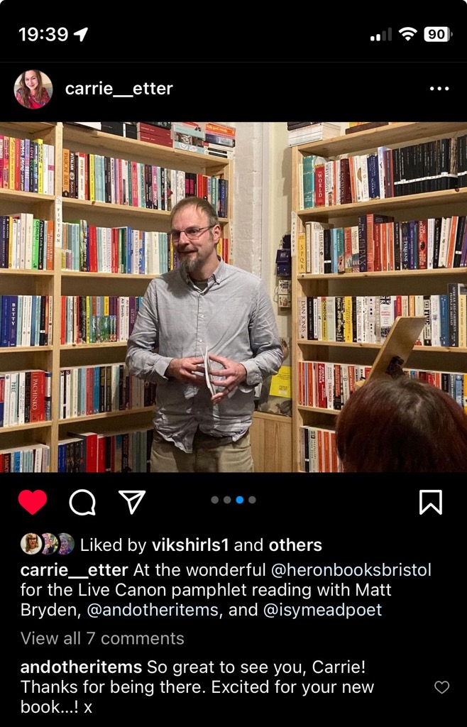 And then in Bristol for the launch of Carrie Etter’s exquisite Grief’s Alphabet.