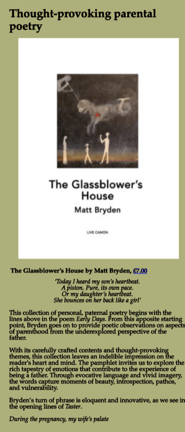 Over the moon that my pamphlet The Glassblower’s House is a winner of Live Canon’s pamphlet competition and will be published in 2023. Thank you to Dr Helen Eastman and the Live Canon stable.